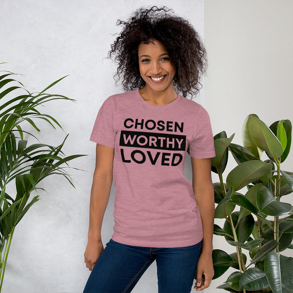 The "Chosen, Worthy, Loved" t-shirt is a powerful way to express your faith in God. Featuring an inspiring message, this tee is a constant reminder of your identity as a child of God.